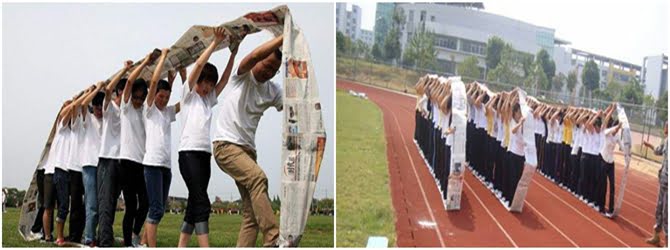 项目目标: 每个组用提供的材料将报纸围成一个可以行进的履带式的环,要求本组所有成员在规则要求下走完规定的路程,以最快到达终点的组为优胜。